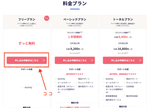 すると、次画面で料金プランが選択されると思うのでフリープランの【申し込む】をクリックしよう。
